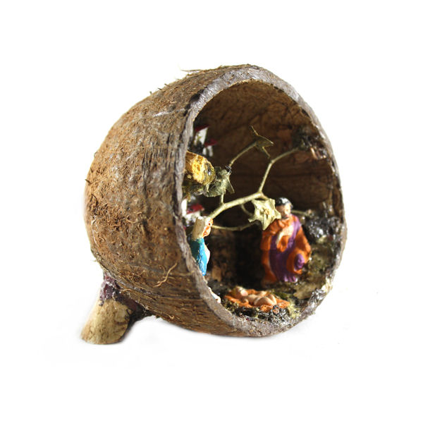 All'interno di un mezzo guscio di cocco è stata inserita la natività, in alabastrino dipinto a mano, con paesino in prospettiva. Il presepe è provvisto anche di luce.
